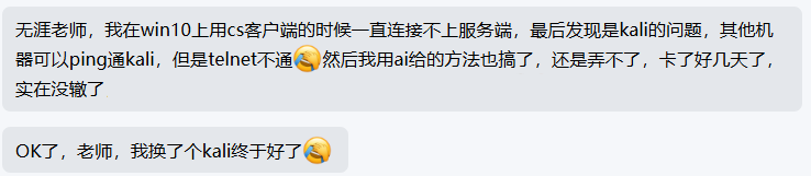 C05-部署Cobalt Strike服务端和启动Cobalt Strike客户端 https://wiki.bafangwy.com/doc/748/ # 排查方法 1、保证客户端和服务端的CS版本一致 2、保证服务端的防火墙是关闭的,不然客户端连接不上 阿里云之类的云服务器要设置安全组: https://wiki.bafangwy.com/doc/722/ 3、服务端的端口和IP地址,在客户端的登录页面一定要一致 4、如果以上都检查了,那就只能提工单问服务器厂商了 比如这个同学买的香港服务器,需要切换网络模式  5、Kali版本问题
