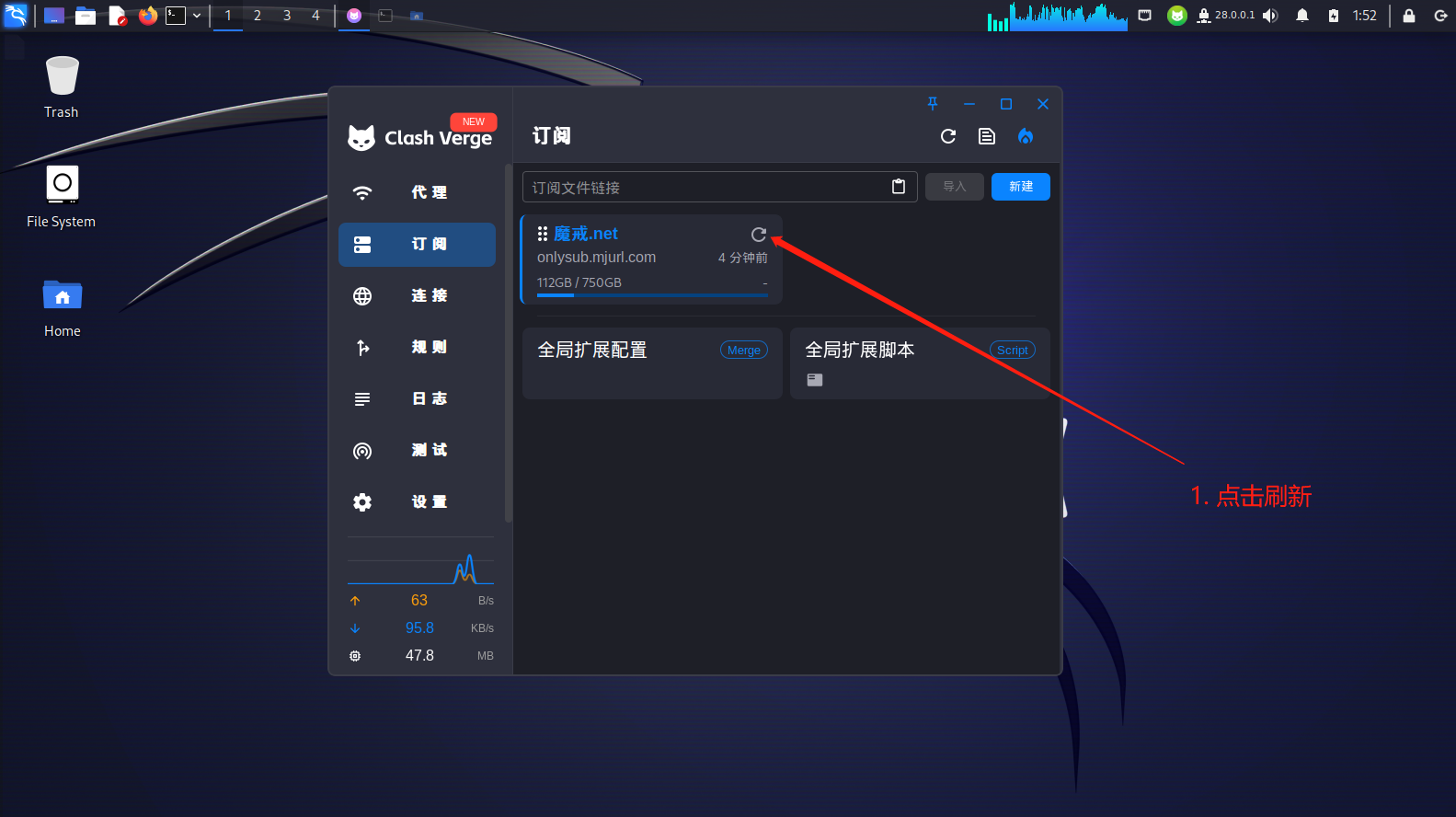 本文演示如果在Kali中使用代理(需要注册付费),访问google.com >d 注意: 1、如果购买的VPN有流量限制,需要注意流量消耗的问题。有的漏洞环境可能会超过几个G大小。 2、“全局”代理会导致物理机所有的软件都走代理,包括微信等等,有可能因为异国登录导致临时封号。建议退出所有登录的软件。一般情况下用“智能”模式即可。 3、全局代理会导致向日葵等远程工具IP定位到国外,无法远程。 4、使用时需要退出“360安全卫士” 5、完成需要的操作以后,关闭“全局代理”。 # 方法1 物理机开启全局代理(推荐,比较简单) 本教程中使用mojie的VPN软件作为演示,[官网链接](https://mojie.app/#/register?code=d2IVZiXn "官网链接"),先注册一个账号(购买15元130G的流量)。 如果注册不了,让班主任发这个:《代理使用方法20241024.docx》 Windows客户端下载地址(在里面找到exe文件下载): https://mojiedown.com/  ## 1、运行代理客户端,登录账号密码 在windows物理机中打开VPN软件,输入账号密码 ## 2、开启全局代理 开启“全局”和“TUN代理”模式,如下图所示 (让虚拟机也使用代理的时候才开启这两个模式,仅物理机使用代理时不用开启)  ## 3、打开VPN代理开关 启动VPN,如下图所示  ## 4、确认虚拟机的网络 (如果本身有这个设置就不用改了) 虚拟机关闭的情况下,打开虚拟网络编辑器   选择vmnet8网卡,取消勾选“将主机虚拟适配器连接到此网络”,然后点击应用 然后勾选“将主机虚拟适配器连接到此网络”,再次点击应用  保存以后再启动kali虚拟机。 ## 5、测试访问网站 在kali虚拟机中使用浏览器访问 google.com 网站进行测试 google.com,如果能打开就是正常的  <font color="red">注意,有的同学设置了以后还是打不开,这种情况下可以尝试重启代理软件、重新关闭打开全局代理开关、重启物理机等等</font> 如果物理机都打不开google.com,那肯定是不正常的。 # 方法2 在虚拟机安装运行代理软件(稍微麻烦一点) ## 环境说明 **请使用2023版本的kali系统来安装clash-verge,2024版本的kali与工具不兼容,无法安装成功!** 补充:有同学反馈kali 2024也是兼容的  参考链接: kali-linux-2023.2-vmware-amd64 https://msb-netdisk.mashibing.com/share/2d14597e67114dc8bba0e30bfd8fd8ff ## 步骤 1. 打开下方链接,下载图中所示的文件 Clash Verge Linux 64位.deb(适用于 Debian/Ubuntu) https://github.com/clash-verge-rev/clash-verge-rev/releases/download/v1.7.7/clash-verge_1.7.7_amd64.deb Clash Verge Linux 64位.rpm(适用于 Fedora/openSUSE) https://github.com/clash-verge-rev/clash-verge-rev/releases/download/v1.7.7/clash-verge-1.7.7-1.x86_64.rpm 参考链接: https://www.kjfx.cc/524.html 2. 启动kali虚拟机,将上一步中下载的文件复制到kali虚拟机中的kali用户的家目录下,如下图所示  3. 打开终端,执行以下命令安装clash,如下图所示 ``` sudo dpkg -i clash-verge_1.7.7_amd64.deb ```  4. 点击kali桌面左上角的程序菜单,搜索clash并点击运行,如下图所示  5. 启动clash后,打开设置并安装服务模式,如下图所示 此处的root密码默认是:`kali`  6. 访问以下链接,登录你的魔戒账户 没有账户的需要注册 [mojie官网](https://mojie.app/#/register?code=d2IVZiXn "官网链接") 7. 登录之后会跳转到首页,点击如下图所示的按钮查看订阅信息  8. 复制订阅链接,如下图所示  9. 在clash的订阅面板粘贴上一步中复制的链接并点击导入  10. 在clash的设置中启动服务模式、打开tun模式并关闭ipv6功能,如下图所示  设置完之后的界面:  11. 在clash的订阅面板,点击刷新魔戒的订阅,如下图所示  12. 测试代理是否配置成功 打开浏览器访问谷歌官网:  打开终端ping谷歌官网: ``` ping www.google.com ```