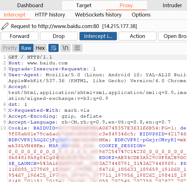 说明: 如果要对手机App或者App的服务器进行渗透,首先需要抓到App发出的HTTP请求包。 准备工作: 1. 可以连上无线网络的电脑,并且安装好Burp 2. 手机,本文以华为手机为例,其他品牌手机的网络代理设置可以自行搜索步骤 # 1、开启电脑Burp监听 首先电脑需要连接到WiFi,不能使用有线网络,这样才能让手机和电脑处于同一网络环境(如果台式机的有线和手机WiFi是同一个网络环境也可以)。 电脑打开cmd,输入ipconfig -all,查看WLAN的IPv4地址:  比如当前IP是192.168.10.142,记住它,等下要用到。 启动Burp,打开Proxy——Options——Add  在打开的添加窗口中,端口依然填写8080,绑定地址选择刚才看到的那个IP地址,如图:  点OK确定。 这时候监听器要勾选新建的这个而不是默认的:  # 2、配置手机WiFi代理 首先将手机连接到与电脑相同的WiFi中。 从手机的“设置”,进入WLAN设置   长按当前连接的WiFi名字,点击弹出的“修改网络”。  在打开的窗口中,勾选“显示高级选项”  开启代理:点击代理开关,在弹出的窗口中选择“手动”。  开启代理开关之后,需要配置代理:  代理已经配置完了。接下来手机上所有的网络请求都会发送到Burp上。 需要注意:并不是你在操作App的时候才会有网络请求。手机上的App无时无刻都在访问网络,所以会抓到很多无关的包。 建议在手动操作之前才打开Burp的拦截开关,这样可以准确地抓到包。 在Proxy——Intercept打开拦截开关:  比如:手机浏览器打开百度搜索,通信包被电脑上的Burp抓到:  至此,抓包的设置就完毕了。 # 3、手机安装证书 对于HTTPS的网站,客户端需要用服务器的密钥加密消息以后发出。 当配置了代理,客户端(浏览器)向burp请求证书,但是burp没有证书,浏览器就会提示不安全。或者,使用了服务器的证书加密,burp抓到的是加密以后的消息,是无法查看和修改的。 所以完整的流程是这样的: 客户端先用burp的密钥加密消息。burp解密称明文以后,再用服务器的密钥加密消息。 所以这里要在手机上安装burp的证书。  选择第一个,DER格式证书,点Next  选择保存的CA路径(比如D盘),文件后缀命名为.cer,非常重要,因为手机只能安装.cer的证书类型,默认的der格式是不能被识别安装的。点击保存,然后Next  导出完毕,关闭窗口:  把文件发送到手机,比如用微信的“文件传输助手”。在手机上“用其他应用打开”。  选择“证书安装器”打开,仅一次  写入证书名称,选择WLAN,确定,安装成功。  在设置里面搜索“证书”,用户凭据,查看证书:  可以看到已经安装的证书:  # 4、取消burp抓包 如果不需要抓手机的包了,需要正常访问,取消代理即可。 长按WiFi名字进入设置——显示高级选项——代理,设置为“无”,保存,即可  此外,也可以在电脑上安装Android模拟器,这样可以直接在电脑上抓模拟器的包,参考: H22-Burp抓包逍遥(安卓)模拟器 https://wiki.bafangwy.com/doc/649