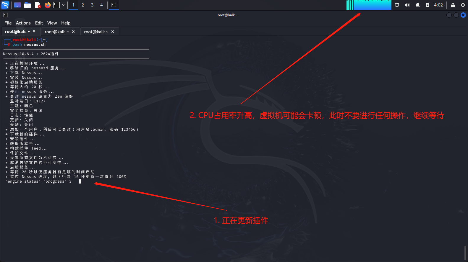# 一、概述 本文使用2024版本的kali linux操作系统演示安装nessus漏洞扫描软件的步骤。 前置条件: 1. 一台2024版本kali linux虚拟机 2. 虚拟机网络正常可用 3. 虚拟机硬盘剩余空间大于10G 参考文章: A11-虚拟机安装Kali和远程连接 https://wiki.bafangwy.com/doc/595 A09-Kali虚拟机磁盘扩容 https://wiki.bafangwy.com/doc/670 环境说明: Kali Linux 2024 Nessus 10.6.4 补丁包版本 202410300224 # 二、安装步骤 1. 启动kali虚拟机,登录系统后打开终端,执行以下命令切换到root用户 ``` sudo su - root ``` 如下图所示:  2. 执行以下命令,将nessus安装脚本下载到当前工作目录 ``` wget https://oss-cdn.mashibing.com/teacher_attachment/149339/nessus_3.sh -O nessus.sh ``` 如下图所示:  3. 执行以下命令,运行nessus安装脚本 ``` bash nessus.sh ``` 如下图所示:  **脚本运行时间较长,运行过程中无需进行任何操作!** **脚本运行过程中需要下载并更新nessus插件,此操作会大量消耗虚拟机的CPU和内存资源,因此脚本一旦运行后就不要使用此虚拟机进行其他操作,放在一旁等待即可!** 当脚本运行到如下图所示的位置时,说明脚本正在下载nessus的插件包,体积较大需等待较长时间,属于正常现象:  当脚本运行到如下图所示的位置时,说明插件包下载完成,正在更新nessus插件,继续等待:  4. 完成安装后脚本会输出nessus的访问地址,如下图所示  访问 Nessus: https://localhost:11127/ 用户名: admin 密码: 123456 5. 登录nessus 使用浏览器打开nessus的访问连接,然后按下图所示的步骤登录nessus  登录后可以看到nessus的主页:  使用浏览器访问此链接:https://localhost:11127/#/settings/about 在打开的页面可以看到nessus的插件与激活状态:  # 三、nessus启停操作(非安装步骤,仅供需要启动或停止nessus时参考) ``` # 停止nessus systemctl stop nessusd # 启动nessus systemctl start nessusd # 重启nessus systemctl restart nessusd ``` # 附录 Nessus如何解除IP限制以及解决重启失效的后遗症 https://www.cnblogs.com/zoey979/p/16201985.html
