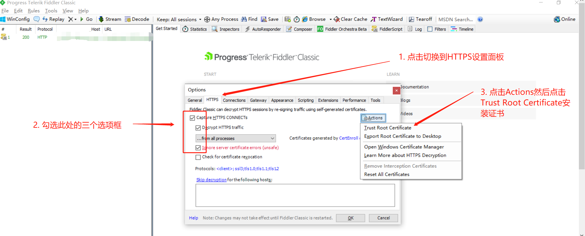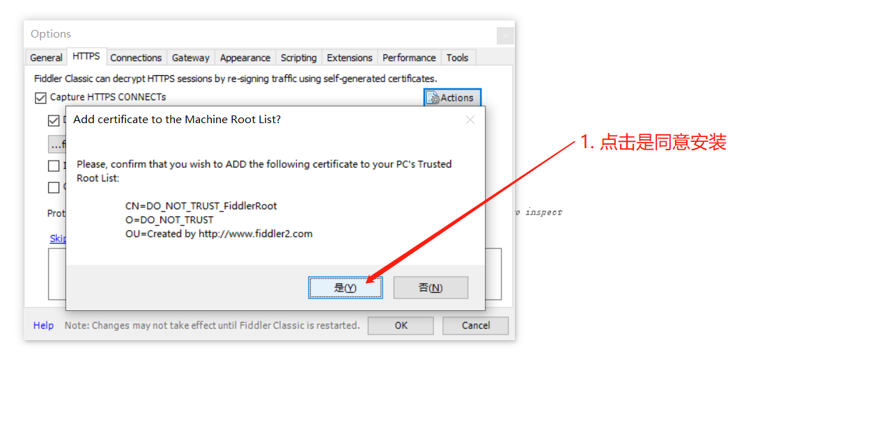 # 一、概述 Fiddler是一个抓包工具,在抓取App的数据包时,它比BurpSuite抓取的包更全,但数据包的修改与重放功能不如BurpSuite好用,本教程演示在Windows 10系统中安装并配置Fiddler与BurpSuite联动抓包的步骤,让Fiddler抓到数据包后传递给BurpSuite,以结合两个工具的优点。 参考文章: 《H01-启动和激活Burp》 https://wiki.bafangwy.com/doc/646 # 二、步骤 1. 访问下面的链接填写信息并下载Fiddler工具的安装包,如下图所示 https://www.telerik.com/download/fiddler  2. 下载完成之后双击安装包程序,开始安装Fiddler 出现如下图所示的提示框时,点击同意:  然后点击安装:  安装完成后点击关闭:  3. 在Windows的开始菜单中启动Fiddler,如下图所示 点此处启动:  启动后进入Fiddler的界面,关闭如下图所示的提示框:  4. 在Fiddler的菜单栏点击Tools,然后打开Options窗口,在Options中找到Connections面板,检查你的设置是否与下图中所示的一致  **此处的设置是Fiddler的默认配置,它默认监听在本机的8888端口,并配置了系统代理,如果你的设置与此处不同,请手动修改,与图中保持一致** 5. 然后在HTTPS设置面板中按如下图所示的步骤安装证书并打开HTTPS解析功能 按下图步骤操作:  弹出此窗口后,点击YES:  弹出此窗口后,点击是:  弹出此窗口后,点击确定:  6. 打开一个cmd窗口,执行ipconfig命令,查看你本机的局域网IP地址,如下图所示  7. 回到Fiddler界面,按下图所示的步骤设置Fiddler的网关(即BurpSuite监听的地址)  8. 启动BurpSuite,按下图所示的步骤设置监听器  9. 重新启动Fiddler工具,然后打开BurpSuite的HTTP History界面,可以看到Fiddler抓取的数据包已经传递到了BurpSuite中,如下图所示  **注意:Fiddler默认监听在8888端口,并且会自动设置系统代理,因此启动Fiddler后,Chrome浏览器等软件的流量会自动被Fiddler捕获,如果你要抓取Firefox或安卓模拟器中的数据包,需要自行将这些软件的代理服务器配置为Fiddler监听的地址。**