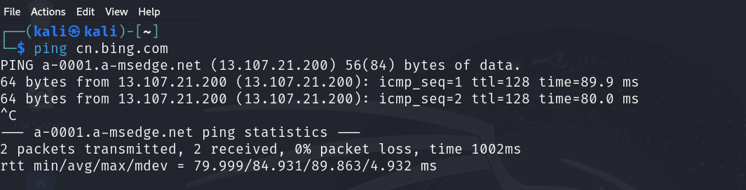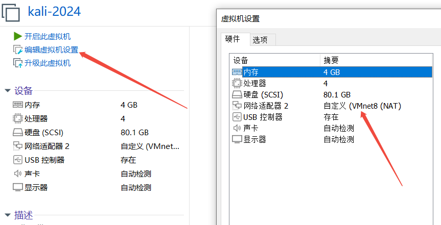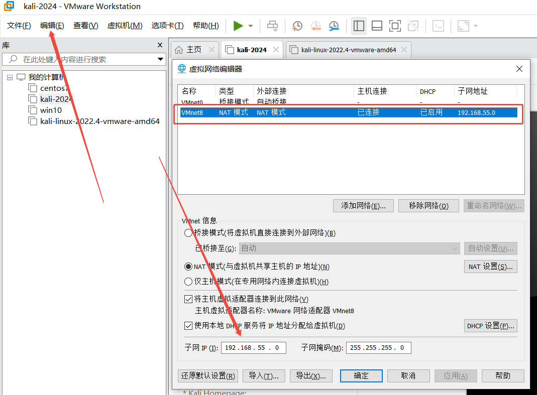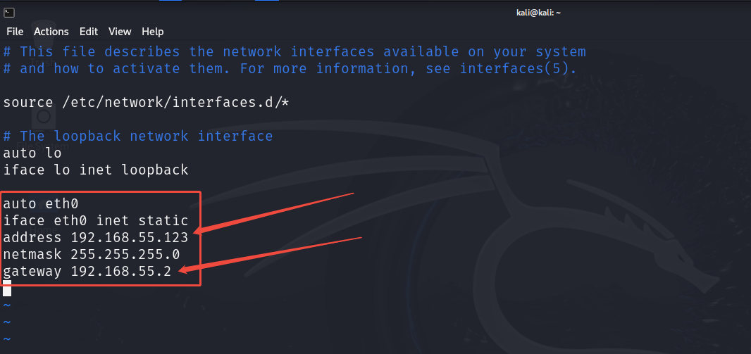 # 参考链接 A11-虚拟机安装Kali和远程连接 https://wiki.bafangwy.com/doc/595/ # 配置步骤 1. 打开vmware,查看你的kali当前用的是哪张虚拟网卡,如下图所示  2. 上一步中,kali用的是vmnet8网卡,打开vmware的虚拟网络编辑器,查看vmnet8网卡的网段 **192.168.55.0这个就是我电脑的vmnet8网卡的网段** 你的网段跟教程中的不同,属于正常现象,不需要修改,先记住它即可  3. 启动kali,打开终端,执行以下命令,输入kali的密码,用vim编辑器打开网卡配置文件 ``` sudo vim /etc/network/interfaces ```  4. 在配置文件末尾加上以下内容 ``` auto eth0 iface eth0 inet static address 192.168.55.123 netmask 255.255.255.0 gateway 192.168.55.2 ``` 这里需要修改两项内容: (1)ip地址 我的网段是192.168.55.0,我设置的ip是192.168.55.123 你需要把address这一项(也就是ip地址),把它的前三位改成你自己的vmnet8的网段地址,最后一位可以随意设置,**最后一位尽量设置成100-200之间的数字,不容易和其他机器冲突**,我这里设置的是123 (2)网关 然后把网关gateway设置成你自己的网段,最后一位是2,固定不变  添加后保存文件 5. 依次执行以下命令,停止并禁用NetworkManager服务,启动networking服务 ``` sudo systemctl stop NetworkManager sudo systemctl disable NetworkManager sudo systemctl mask NetworkManager sudo systemctl start networking sudo systemctl enable networking sudo systemctl restart networking ```  6. 执行以下命令,查看ip地址是否修改成功 ``` ip addr ```  7. 执行ping命令测试网络连通性,有响应结果代表静态ip配置成功 ``` ping cn.bing.com ```  有时候ping百度等网站没有响应也是正常现象,可以打开kali里面的浏览器然后访问百度主页,如果能访问则代表网络正常