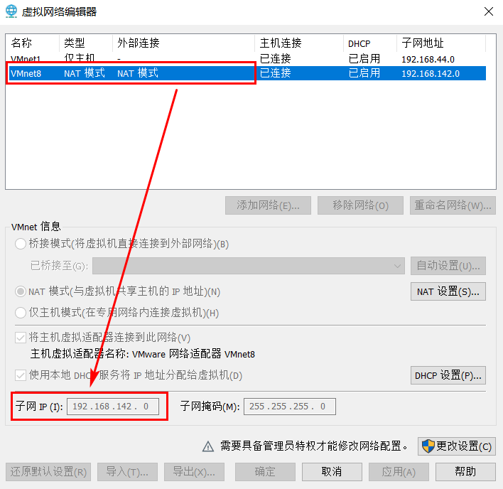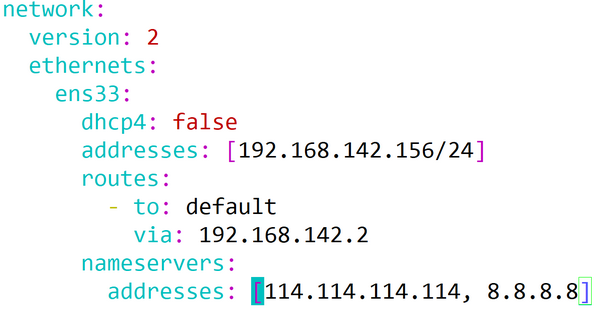 A33-Vmware安装Ubuntu24 https://wiki.bafangwy.com/doc/858/ # 说明 在默认情况下,Ubuntu虚拟机的网络模式是DHCP(动态分配IP)模式。 **在虚拟机中,IP地址一旦分配以后,一般是不会改变的,所以不需要设置静态IP。** 如果对IP地址有特殊需求,需要指定IP,那么可以参考本教程进行修改。 # 查看NAT网段 命令 `ip a` 默认网卡名称:ens33, inet后面的IP前三位就是NAT的网段。  在虚拟网络编辑器中也能看到:  如果在此处修改了NAT网段,那么就要以此处的网段为准。  # 编辑网络配置文件 `vi /etc/netplan/50-cloud-init.yaml` 修改前:  修改后:  为避免格式出错可复制以下内容修改: 注意: 网段`142`要改成你的NAT网段。 addresses是IP地址,后面的`/24`是掩码,不变。 nameservers是DNS服务器,一个主一个备。 ``` network: version: 2 ethernets: ens33: dhcp4: false addresses: [192.168.142.156/24] routes: - to: default via: 192.168.142.2 nameservers: addresses: [114.114.114.114, 8.8.8.8] ``` 应用修改: `netplan apply` 测试网络: `ping baidu.com`