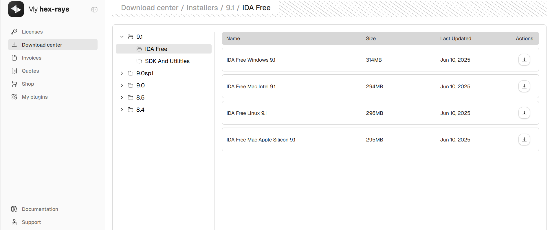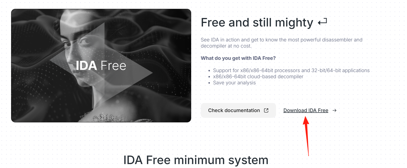 ## Windows下调试工具安装 ### IDA IDA,有自己用的顺手的就用自己用的顺手的版本,课程版本为IDA 9.1 free 官网地址地址: https://hex-rays.com/ida-free 打开以后申请一个`license Key`  往下滑找到 `Download IDA free`  选择对应的系统版本  下载安装包 安装完成以后打开会报  这个时候去你的账户下找到你的`license Key` 下载文件  去邮箱查看  下载好后导入你的`key`  安装完成 ### Xdbg 官网: https://x64dbg.com/ 直接下载   下载好后解压到你喜欢的目录下即可 ### windbg 去到Windows官网 https://learn.microsoft.com/zh-cn/windows-hardware/drivers/debugger/ 选择你能够运行的方式下载(可能需要科学上网)  ### vscode 官网: https://code.visualstudio.com/ 直接下载 安装即可  ### visual studio 2022 官网地址 https://visualstudio.microsoft.com/zh-hans/vs/  下载以后打开 必选的就是 MFC生成工具 其他的按照个人喜好来 不知道的就按照图上的配置就行  记得更改安装目录