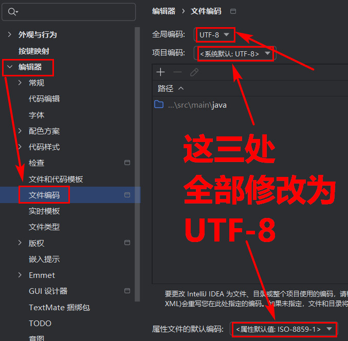 # 问题描述 例如: applicaiton.properties application.yml 中文注释乱码:  # 解决办法 进入 File → Settings → Editor → File Encodings。 文件——设置——编辑器——文件编码 将以下选项全部设置为 UTF-8: - Global Encoding(全局编码) - Project Encoding(项目编码) - Default encoding for properties files(**关键!**)(属性文件的默认编码)  # 效果