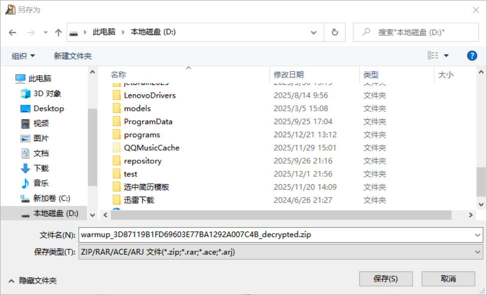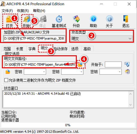 # 软件版本 WinRAR 6.22 # 题目 题目链接:https://adworld.xctf.org.cn/task/task_list?type=misc&number=1&grade=1&page=4 或者搜索:warmup # 明文暴破的原理 软件通过对比「明文内容(未加密的压缩包)」和「压缩包内加密文件的密文」,反推出压缩密码,满足 2 个核心条件才能用: 1、你有这个文件的完整明文原版 2、未加密压缩包只能包含 1 个文件; # 准备压缩包 因为题目给到的文件,一个是`open_forum.png`,一个是加密的压缩包:`warmup_3D87119B1FD69603E77BA1292A007C4B.zip` 而`warmup_3D87119B1FD69603E77BA1292A007C4B.zip`里面包含了`open_forum.png`,推测是同一个文件,因此考虑明文攻击。 首先,我们用WinRAR对`open_forum.png`进行打包,得到`open_forum.zip`  如果你自己做的压缩包不行,可以试试这个: [【附件】open_forum.zip](/media/attachment/2025/12/open_forum.zip) # 明文攻击  大约几秒钟以后就可以点“停止”(在“开始”按钮的右边): 弹出密钥已恢复的窗口:  点“确定”,弹出保存解密压缩包的窗口: