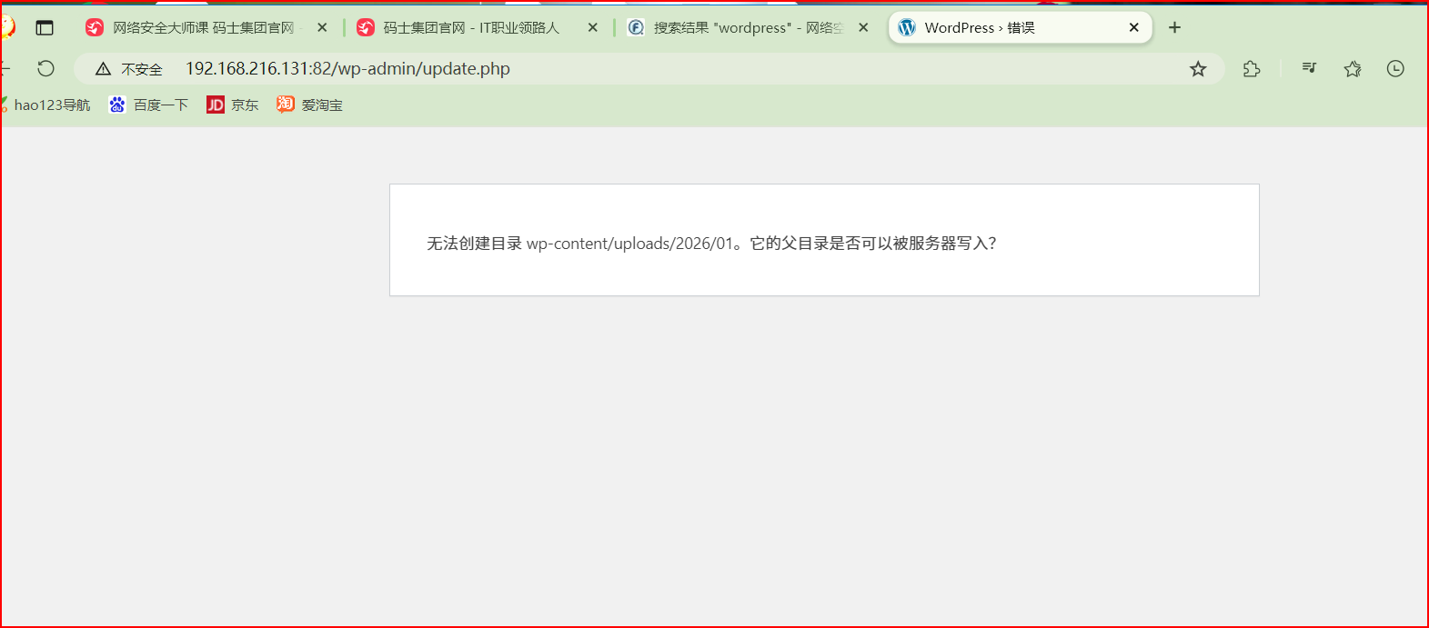 关联问题: https://www.mashibing.com/question/detail/115924 # 问题描述: 无法创建目录wp-content/uploads/2026/01。它的父目录是否可以被服务器写入?  要执行请求的操作,WordPress需要访问您网页服务器的权限。请输入您的FTP登录凭据以继续。如果您忘记了您的登录凭据(如用户名、密码),请联系您的主机提供商。  # 原因分析 这个问题是**WordPress写入权限配置**导致的,结合Docker环境的特性,可以按以下步骤解决: # 问题1:无法创建目录(权限问题) Docker中WordPress容器的文件权限默认可能不匹配Web服务(如Apache/Nginx)的运行用户,需要调整`wp-content/uploads`目录的**属主/权限**: 1. 进入WordPress容器: ```bash docker-compose exec wordpress_404_rce bash ``` 2. 修改`wp-content`目录的属主(Web服务通常用`www-data`用户): ```bash chown -R www-data:www-data /var/www/html/wp-content ``` 3. 同时确保目录权限为可写(建议`755`,避免过宽权限): ```bash chmod -R 755 /var/www/html/wp-content ``` # 问题2:提示需要FTP信息(权限+配置问题) WordPress在无法直接写入文件时,会默认请求FTP信息,可通过**修改wp-config.php配置**跳过FTP步骤: 1. 进入WordPress容器,编辑`wp-config.php`(路径通常是`/var/www/html/wp-config.php`): ```bash docker-compose exec wordpress_404_rce vi /var/www/html/wp-config.php ``` 2. 在文件中添加以下代码(添加到`define('DB_...'`配置之后): ```php define('FS_METHOD', 'direct'); define('FS_CHMOD_DIR', 0755); define('FS_CHMOD_FILE', 0644); ``` (`FS_METHOD = direct`表示直接写入文件,跳过FTP验证) # 验证 重启容器后,重新尝试上传/更新操作: ```bash docker-compose restart ```