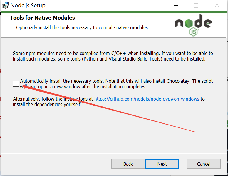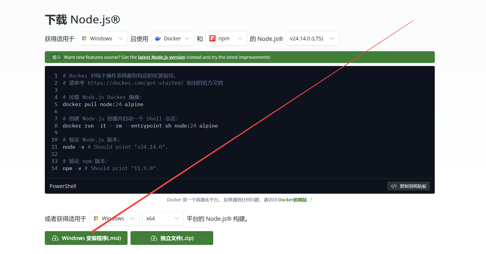 # 简介 课程中的使用到的一些工具,需要通过nodejs的包管理器来安装,或者依赖nodejs环境,这篇教程展示在windows上安装nodejs的步骤 # 安装步骤 1. 访问下面的链接下载nodejs安装包 https://nodejs.org/zh-cn/download  2. 下载完成之后双击安装包开始安装 点击Next  3. 勾选同意协议,点击next  4. 路径保持默认,点击next  5. 这里的选项不用修改,点击next  6. 这里的选项不要勾选,点击next进行下一步  7. 点击install开始安装  8. 出现这个页面代表安装成功  # 配置镜像源(必做) 打开cmd窗口执行下面的命令 ``` npm config set registry https://registry.npmmirror.com ```